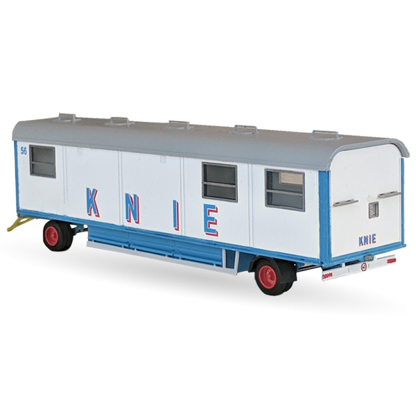 Unpainted kit of a Circus Knie kitchen for artists wagon #56 in scale 1:87 (H0) made of brass and plastic parts. The kit includes chassis, wheel-sets, decals, roof and staircases.