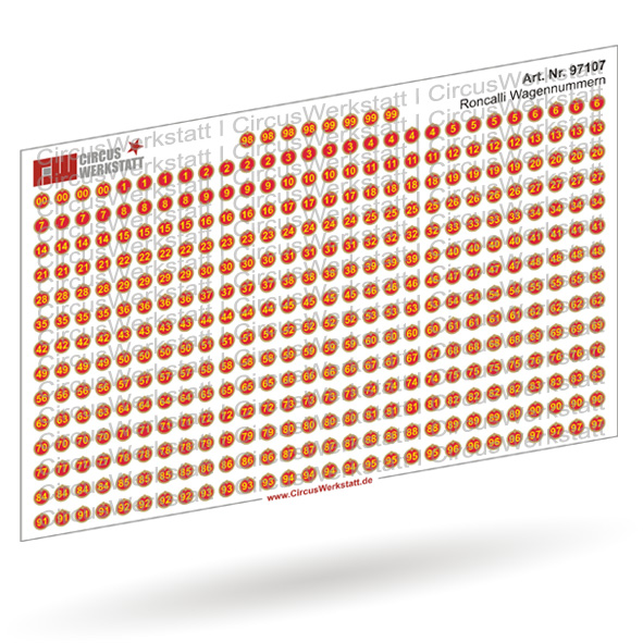 Nassschieber Set mit diversen Wagennummern im nostalgischen Rahmen, wie beim Circus Roncalli in 1:87. Das Set besteht aus jeweils 4 Nummer von 00-99. Das Set eignet sich ideal für die Beschriftung von verschiedenen Circus Roncalliwagen, die selbst gebaut sind oder sich in unserem Sortiment finden.