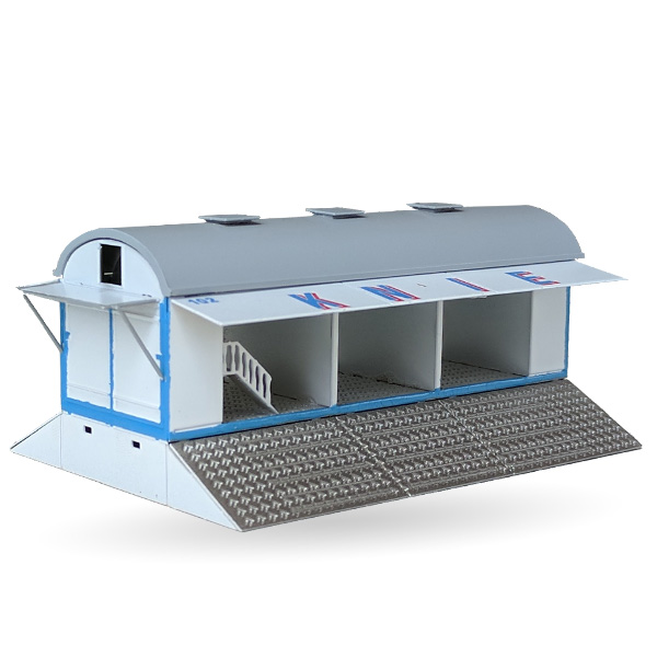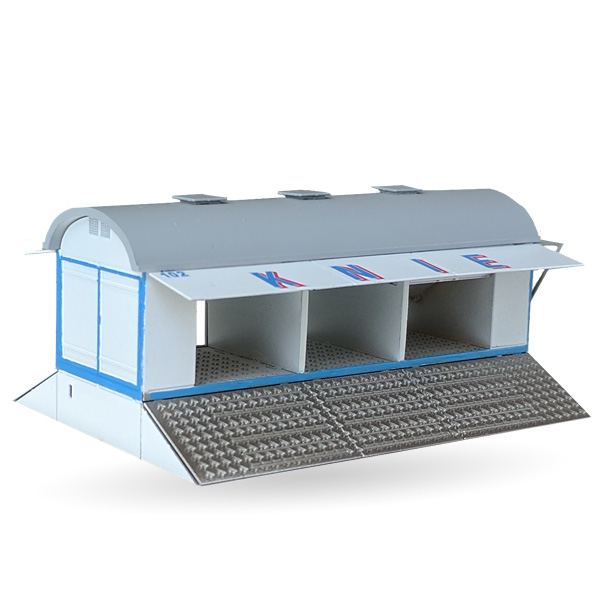 Unpainted kit of a Circus Knie goat wagon #102 in scale 1:87 (H0) made of brass and plastic parts. The kit includes chassis, weehlsets, decals, roof and ramps.