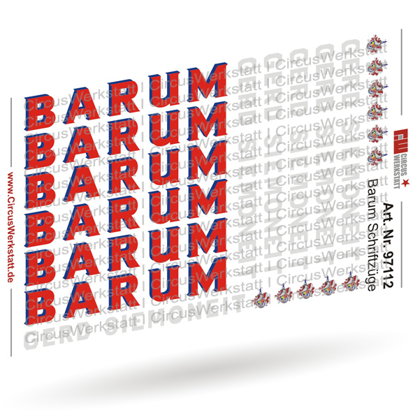 Water transfer letters for Circus Barum with 6x "BARUM", 6x "GERD SIEMONAEIT and 11x Barum logos in scale 1/87. For assembling, different tools and water are needed.