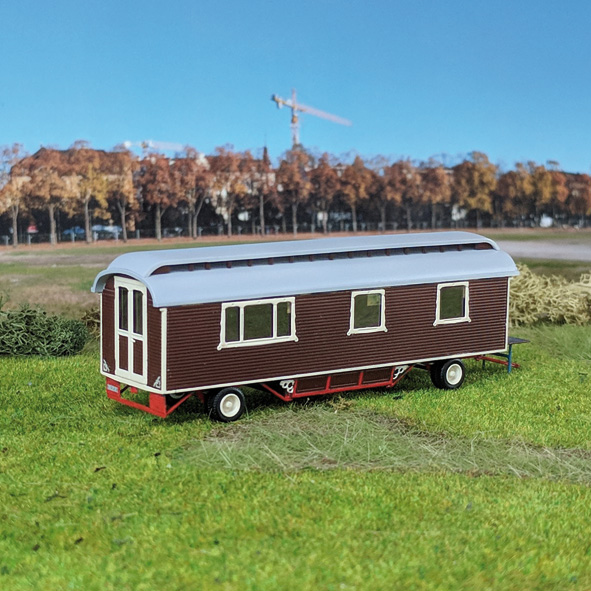 Unpainted kit of a Circus Roncalli Café wagon in scale 1:87 (H0) made of brass and plastic parts. The kit includes chassis and wheel-sets.