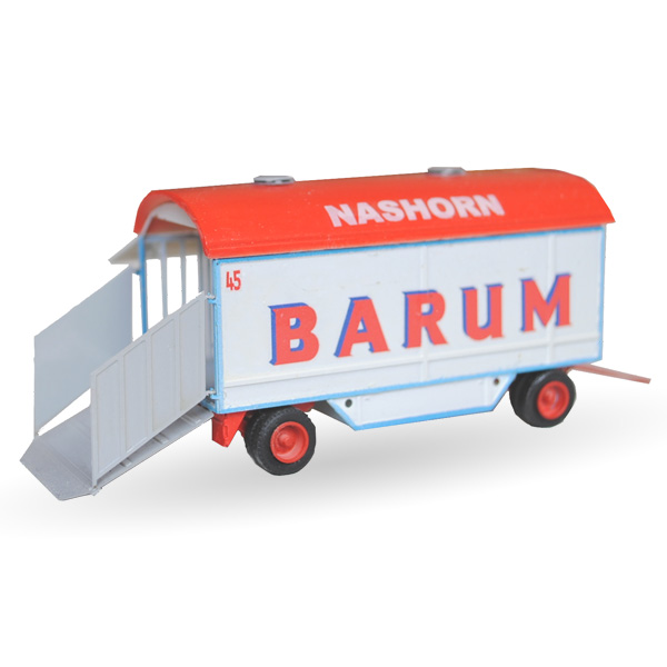 Unpainted kit of a Circus Barum rhino wagon in scale 1:87 (H0) made of brass, plastic, resin parts. The kit includes chassis, wheel-sets, decals roof and ramp.