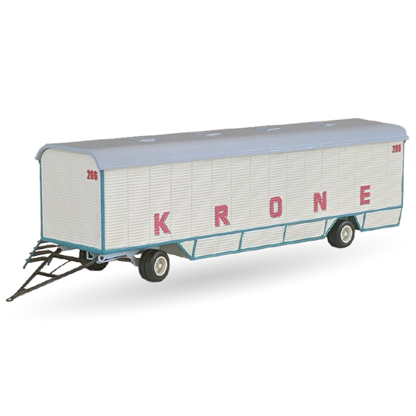 Unpainted kit of a Circus Krone crew wagon #206 in scale 1:87 (H0) made of brass and plastic parts. The kit includes chassis, wheel-sets, decals, roof and staircases.